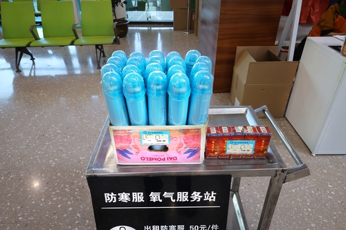 매표소 입구에는 방한복을 빌려주고 휴대용 산소통을 판매하는 상점이 있다.