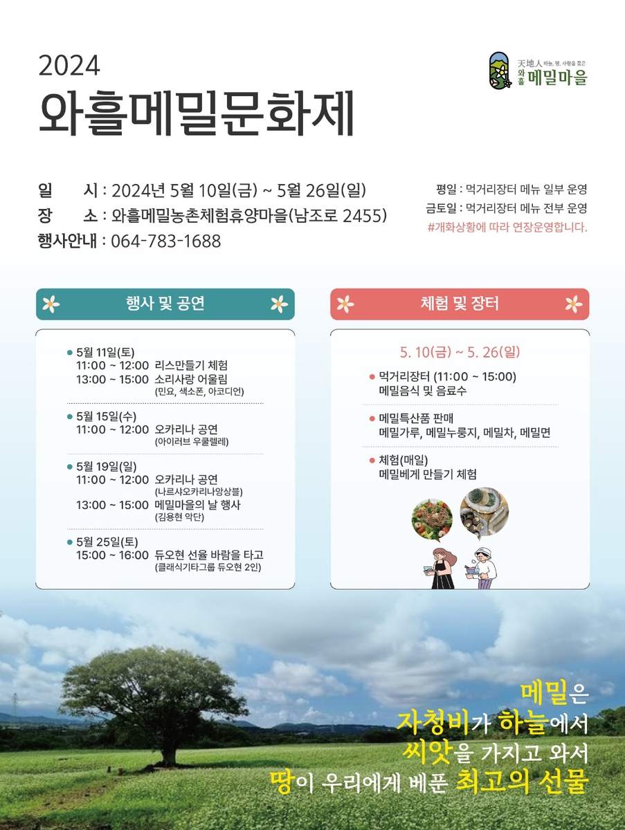 제주관광협회는 오는 10일부터 26일까지 제주시 조천읍 와흘메밀농촌체험휴양마을에서 '2024 와흘메밀문화제'를 개최한다고 9일 밝혔다.