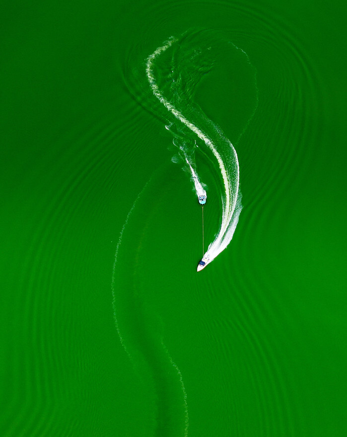 Holidaymakers enjoy water sports on Jicheon Reservoir, hit by hazardous green algae blooms, in Chilgok, North Gyeongsang Province, southeastern South Korea, on July 11, 2025. (Yonhap)