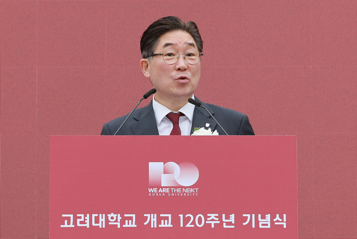 Kim Dong-one, president of Korea University, addresses a ceremony at the school in Seoul on May 5, 2025, to celebrate the 120th anniversary of its founding. (Yonhap)