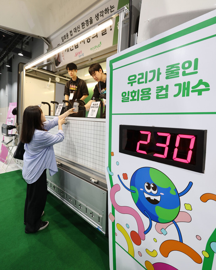 A visitor gets a free beverage with a cup she brought during the Korea Circular Economy Festival on promoting waste reduction, recycling and sustainable business innovation at a convention center in Seoul on July 2, 2025. (Yonhap)