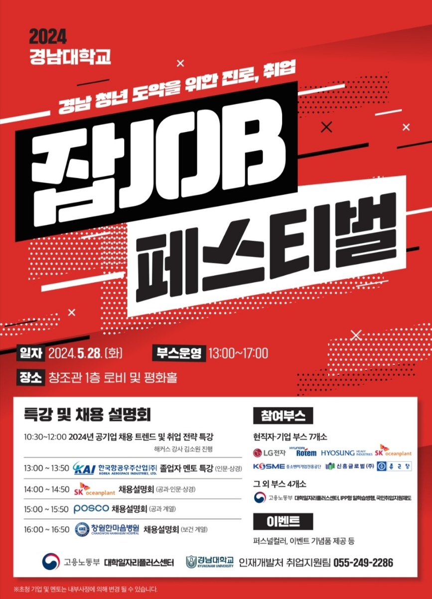 학생과 지역 청년 구직자에게 다양한 취업 정보를 제공하기 위해 마련된 이번 행사는 경남대 대학일자리플러스센터가 주관한다.