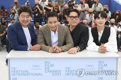 | ▲ 16일(현지시간) 프랑스 칸에서 열린 제74회 칸 국제 영화제의 영화 '비상선언' 포토콜 행사에서 한재림 감독(왼쪽 세 번째)과 주연배우인 송강호(왼쪽부터), 이병헌, 임시완이 나란히 포즈를 취하고 있다.[AFP=연합뉴스] |