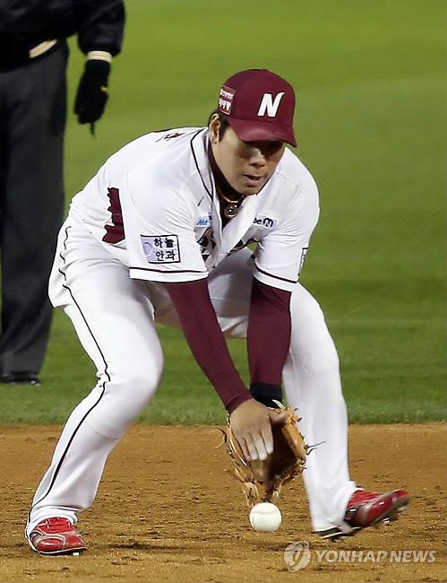 | ▲  In this file photo from Nov. 11, 2014, Kang Jung-ho of the Nexen Heroes commits an error in the top of the fourth inning of Game 6 of the Korean Series against the Samsung Lions at Jamsil Baseball Stadium in Seoul. (Yonhap) |