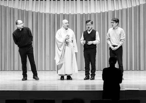| ▲ 만남 중창단 (서울=연합뉴스) 4대 종교 성직자로 구성된 만남중창단이 연습하고 있다. 왼쪽부터 천주교 하성용 신부, 불교 성진스님, 개신교 김진 목사, 원불교 박세웅 교무. |
