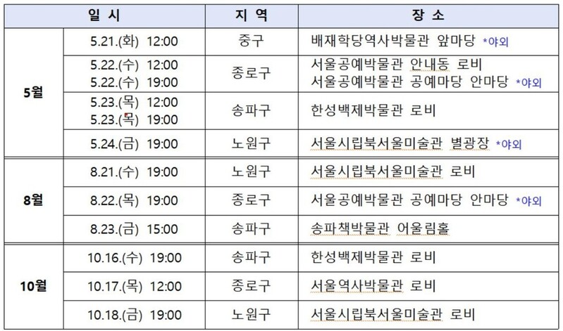 8월에는 21일 서울시립북서울미술관(19시), 22일 서울공예박물관(19시), 23일 송파구 송파책박물관(15시)에서 공연한다.