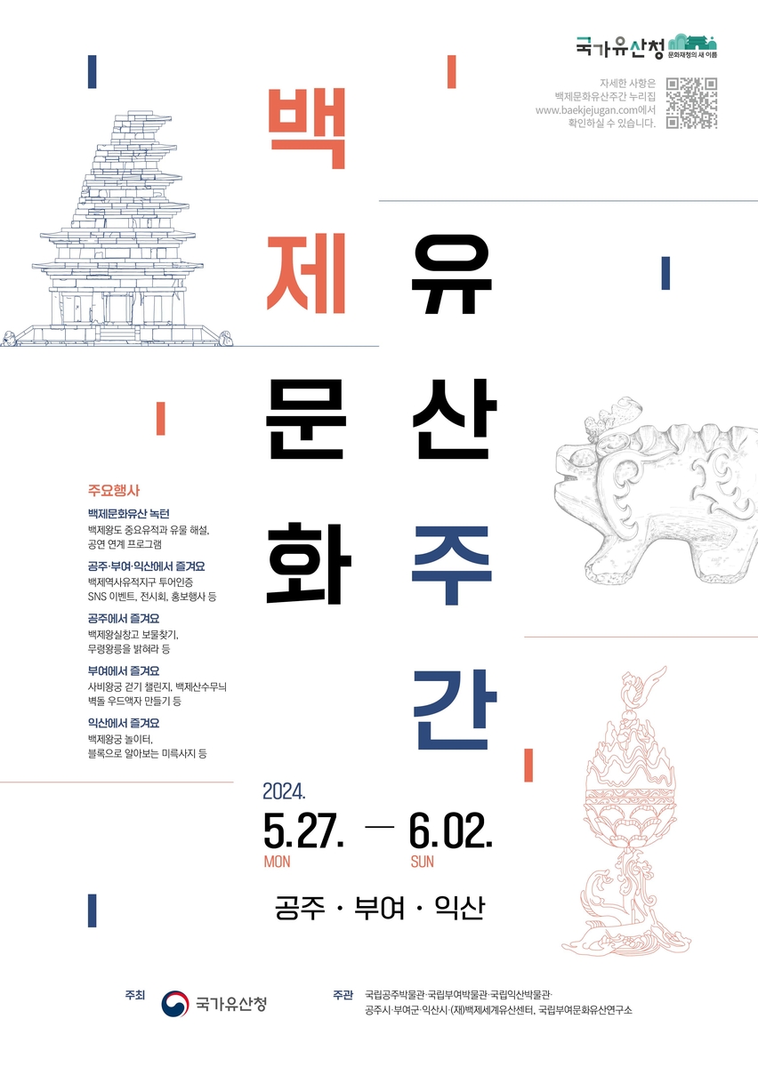 국가유산청은 이달 27일부터 6월 2일까지 일주일간 충남 공주시·부여군, 전북 익산시 일대에서 '백제문화유산주간' 행사를 연다고 20일 밝혔다.