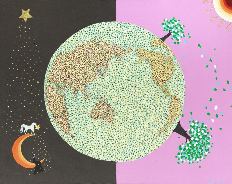 이 작가는 "아들을 돌보면서 숱한 좌절을 겪었으나 어느 날 무명 행성에서 온 어린왕자와 먼 여행을 하는 나를 상상하자 삶의 질이 확연히 달라졌고, 그런 행복감을 캔버스에 그렸다"고 말했다.