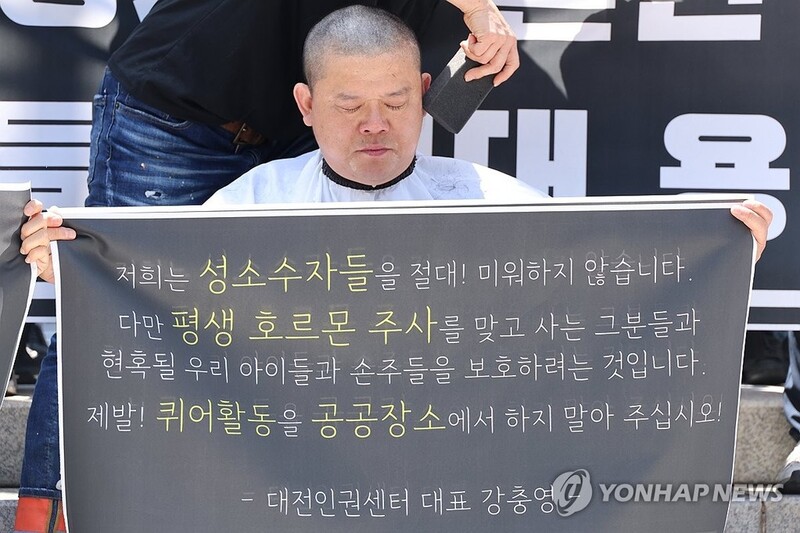 | ▲ 대전 퀴어축제 반대하는 일부 시민단체 (대전=연합뉴스) 강수환 기자 = 퍼스트코리아시민단체 등 대전지역 일부 학부모·시민단체 62개가 연합한 단체는 14일 대전시청 앞에서 퀴어축제에 반대하는 기자회견을 열고 있다. 이날 기자회견에 참여한 대전인권센터 강충영 대표는 축제를 규탄하며 삭발식을 강행했다. 앞서 제1회 대전퀴어문화축제를 준비하는 조직위원회는 이날 출범 기자회견을 열고 하반기 대전에서 퀴어문화축제를 개최할 예정이라고 밝혔다. 2024.5.14 swan@yna.co.kr |