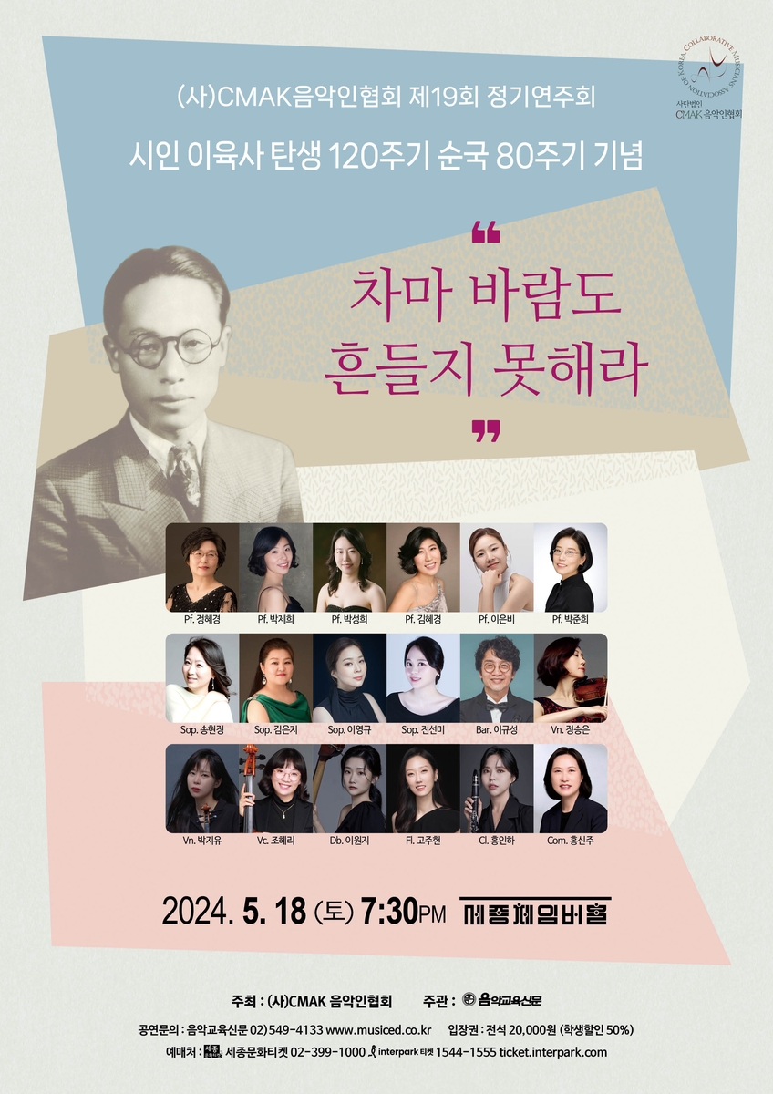 ▲ 이육사 탄생 120주기 기념연주회 = 사단법인 CMAK음악인협회는 시인이자 독립운동가인 이육사 탄생 120주기, 순국 80주기를 맞아 오는 18일 서울 세종문화회관 체임버홀에서 기념연주회를 한다고 14일 밝혔다. 시인은 1904년 5월 18일 경북 안동에서 태어났다.