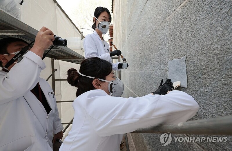 | ▲ 스프레이 낙서 경복궁 담장, 추가 보존 처리 (서울=연합뉴스) 김인철 기자 = 18일 서울 종로구 경복궁 영추문에서 지난해 말 스프레이 낙서로 훼손된 궁궐 담장에 2차 보존 처리 작업이 진행되고 있다. 2024.4.18 yatoya@yna.co.kr |