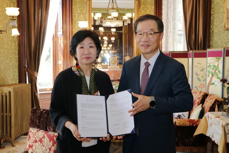 | ▲ 국외소재문화유산재단-포스코인터내셔널 업무협약 왼쪽부터 김정희 국외소재문화유산재단 이사장, 박진우 포스코인터내셔널 북미지역 총괄 법인장 [국외소재문화유산재단 제공. 재판매 및 DB 금지] |