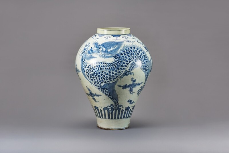 이건희 회장이 기증한 청화백자 항아리는 왕실을 상징하는 용무늬가 돋보이는 도자 유물로, 국립중앙박물관 측은 '휴스턴 한국실의 하이라이트'라고 꼽았다.