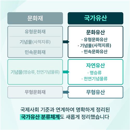 이에 따라 1962년 '문화재보호법'이 제정된 이래 널리 쓰여왔던 '문화재' 대신 '국가유산'을 중심으로 한 법·행정 체계를 새롭게 적용한다.