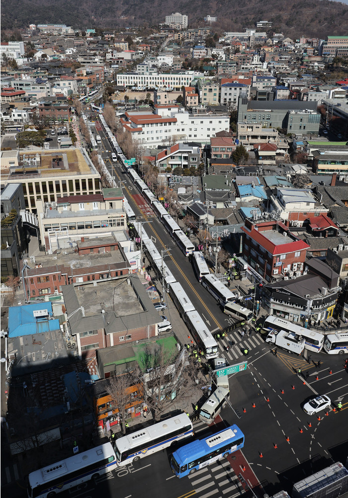 Barricades of police buses are seen on a road in front of the Constitutional Court in Seoul on Feb. 20, 2025, as the court is set to hold the 10th hearing of detained President Yoon Suk Yeol's impeachment trial in connection with his short-lived imposition of martial law in December. (Yonhap)