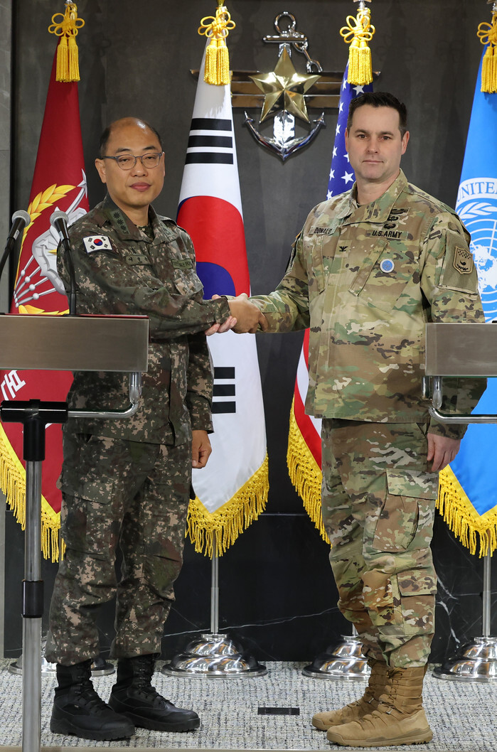 Lee Sung-joon (L), public affairs director of South Korea's Joint Chiefs of Staff (JCS), and his U.S. Forces Korea counterpart, Ryan Donald, pose for a photo during a joint press conference at the JCS headquarters in Seoul on March 6, 2025, to announce that South Korea and the United States will begin a key annual joint military exercise, the Freedom Shield, next week to enhance their combined defense capabilities against North Korean military threats. (Yonhap)