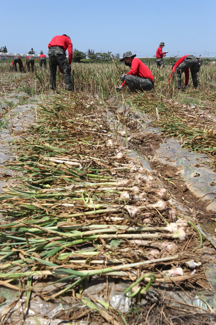 South Korean marines harvest garlic on a field in the city of Seogwipo on South Korea's largest island of Jeju on May 13, 2021, as they volunteer to help farmers amid labor shortages in the farming sector. (Yonhap)