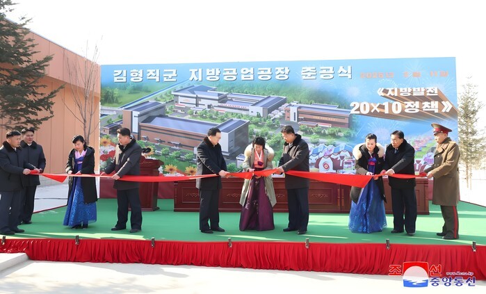 North Korean party residents cut the ribbon during the inauguration ceremony of regional factories in Kim Hyong Jik County, Ryanggang Province, on Feb. 11, 2025, in this photo released by the North's official Korean Central News Agency the next day. The dedication of the factory is part of a project that the North's leader Kim set forth in January 2024 to build modernized factories in 20 cities and counties over the next decade to enhance the living standards of the people. (For Use Only in the Republic of Korea. No Redistribution) (Yonhap)