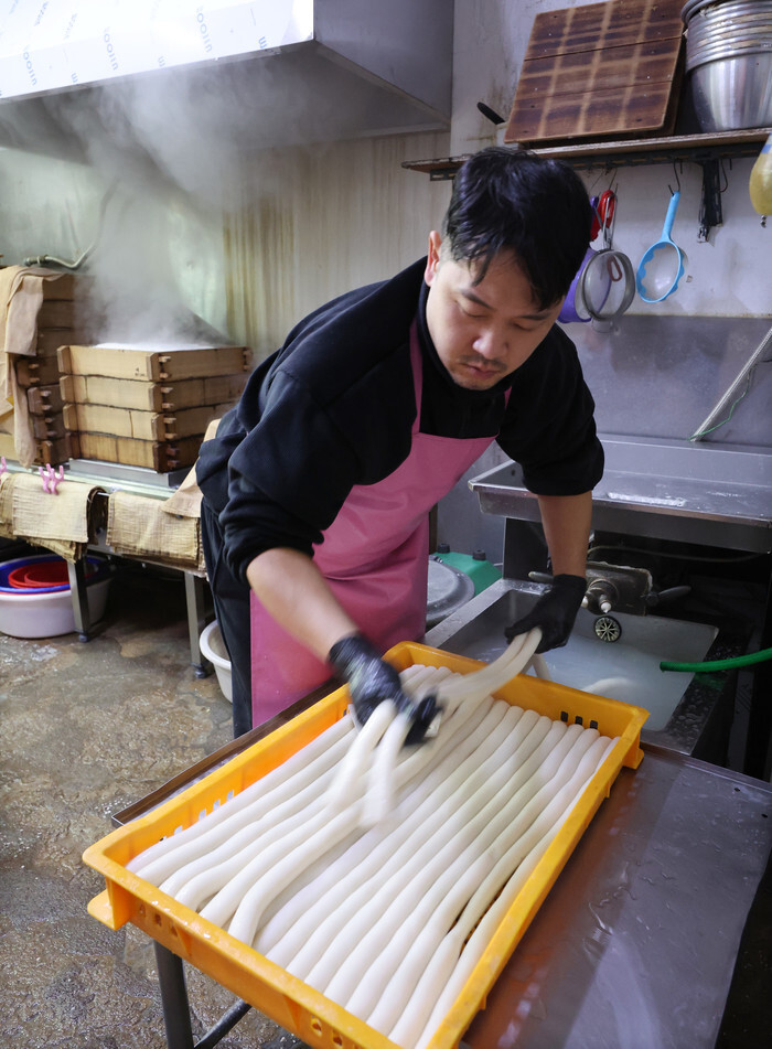 A man lays out "garaetteok," a Korean rice cake stick, just churned out of a rice cake machine at his shop at a traditional market in the southeastern port city of Busan on Jan. 15, 2025, ahead of the Lunar New Year holiday, which falls on Jan. 29 this year. Garaetteok is a staple used to make a traditional soup of sliced rice cake eaten during the holiday. (Yonhap)