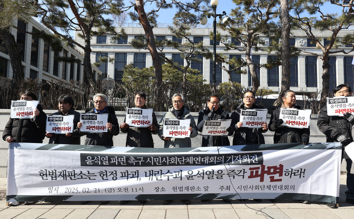 Members of the Civil Society Organizations stage a rally in front of the Constitutional Court in Seoul on Feb. 21, 2025, to call for the court to decide to remove impeached President Yoon Suk Yeol from office in connection with his short-lived imposition of martial law in December. (Yonhap)