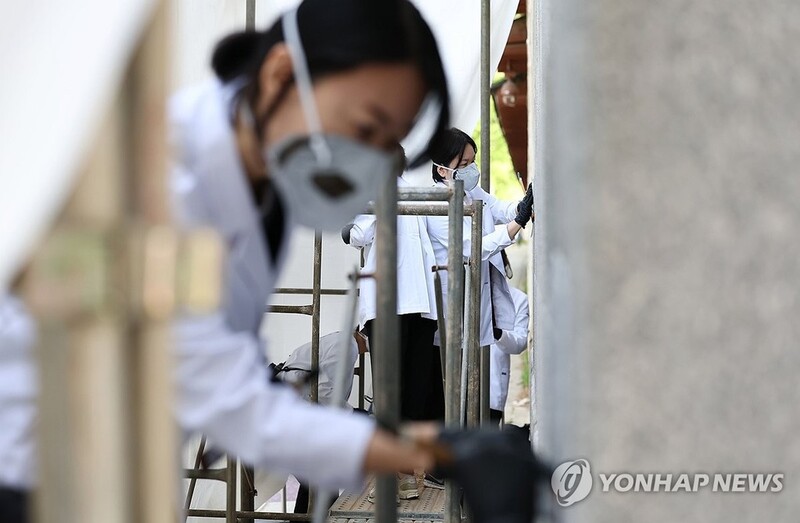 | ▲ 낙서로 훼손된 영추문 담장, 2차 보존 처리작업 (서울=연합뉴스) 김인철 기자 = 18일 서울 종로구 경복궁 영추문에서 지난해 말 스프레이 낙서로 훼손된 궁궐 담장에 2차 보존 처리 작업이 진행되고 있다. 2024.4.18 yatoya@yna.co.kr |