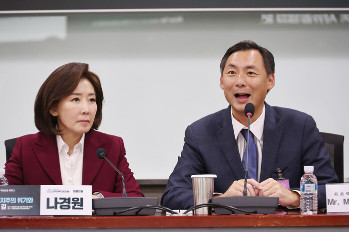 Morse Tan (R), former ambassador-at-large for the U.S. State Department's Office of Global Criminal Justice, speaks at the National Assembly in Seoul on March 6, 2025, during a seminar on the rule of law and the South Korea-U.S. alliance, hosted by Na Kyung-won, a lawmaker of the ruling People Power Party. (Yonhap)