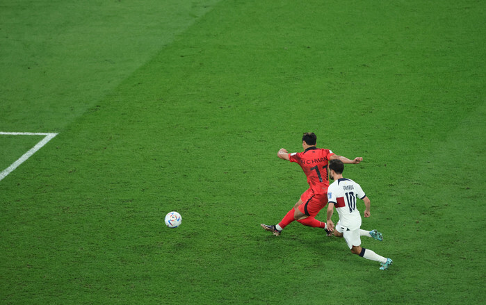 Hwang Hee-chan scores the winning goal in the final Group H match against Portugal at the FIFA World Cup in Education City Stadium in Al Rayyan, west of Doha, Qatar, on Dec. 2, 2022. South Korea beat Portugal in a 2-1 win that sent the Asian country advancing to the last 16. (Yonhap)
