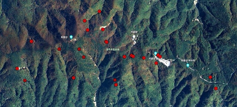 보고서에 따르면 재작년 9월 태풍 힌남노가 내습했을 때를 전후로 토함산에 산사태가 발생하기 시작해 해발고도 400~700m 지대를 중심으로 현재 약 24곳에서 진행 중이다.