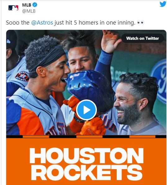 | ▲ 한 이닝 5홈런을 친 휴스턴을 소개한 MLB 트위터 [MLB 트위터 캡처. 재판매 및 DB 금지] |