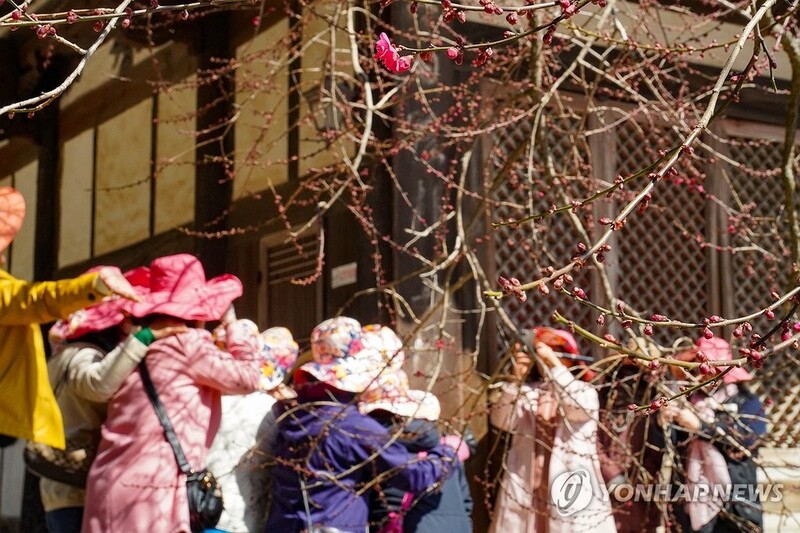 | ▲ 구례 화엄사 홍매화 개화 (구례=연합뉴스) 장아름 기자 = 9일 전남 구례군 마산면 대한불교조계종 19교구 본사 지리산대화엄사에서 열린 국가유산(천연기념물, 구례 화엄사 화엄매)지정 기념행사 및2024 제4회 홍매화·들매화 프로 사진 및 휴대폰 카메라 사진 콘테스트 개회식에서 관광객들이 몽우리를 터트린 홍매화를 휴대전화에 담고 있다. 화엄사 홍보기획위원회 관계자는 "홍매화는 일주일 정도 뒤에 만개해 2~3주 화려한 자태를 뽐낼 것"이라고 말했다. 2024.3.9 areum@yna.co.kr |