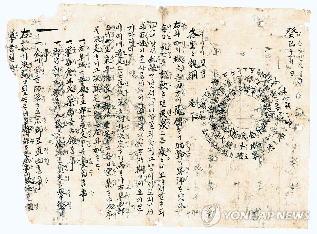 | ▲ 기탁된 동학농민혁명 최고 기록물 '사발통문' (정읍=연합뉴스) 동학농민혁명기념재단에 기탁된 동학농민혁명의 최고 기록물인 '사발통문' 사발통문은 동학혁명이 일어나기 직전 해인 1893년 11월 전봉준을 비롯한 22명의 동학 간부들이 모여 농민군의 최종 목표를 적은 문서로, 주모자를 알 수 없도록 사발처럼 둥근형태로 서명한 것이다. 2015.2.10 <<동학농민혁명기념재단>> doin100@yna.co.kr |