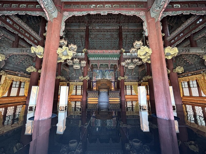 지난달 27일 찾은 인정전은 왕이 앉는 어좌(御座) 좌우로 전통 조명인 좌등 형태를 활용한 공예품 8점이 늘어서 있었다. 시시각각 색이 변하는 조명 너머로는 '둥둥' 하는 북소리가 울려 퍼졌다.
