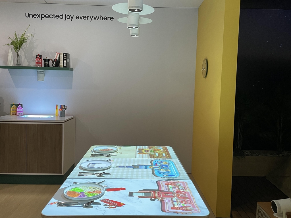 | ▲ 삼성전자 '더 프리스타일'을 천장 조명으로 만들어 식탁에 화면을 만든 모습 [촬영=김영신 기자] |
