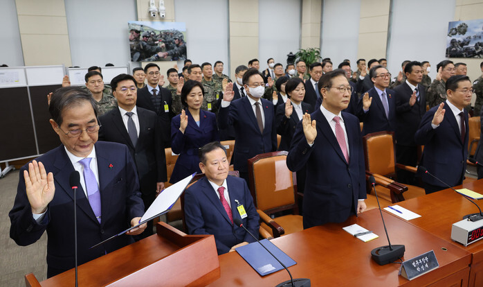 Former Interior Minister Lee Sang-min (2nd from L, front) refuses to take an oath at the National Assembly in Seoul on Jan. 22, 2025, during the first hearing of a parliamentary special committee on impeached President Yoon Suk Yeol's insurrection allegations in connection with his botched martial law declaration. (Yonhap)