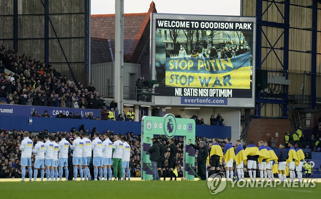 홈팀 에버턴 선수들은 우크라이나의 국기를 몸에 둘렀다.