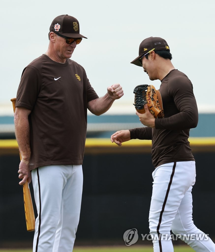 | ▲ 김하성 격려하는 밥 멜빈 샌디에이고 감독 2월 21일(현지시간) 미국 애리조나주 피오리아 스포츠 콤플렉스에서 열린 미국 메이저리그(MLB) 샌디에이고 파드리스의 스프링 캠프 훈련. 김하성이 내야 수비 훈련을 마친 뒤 밥 멜빈 샌디에이고 감독이 김하성을 격려하고 있다. [연합뉴스 자료사진] |
