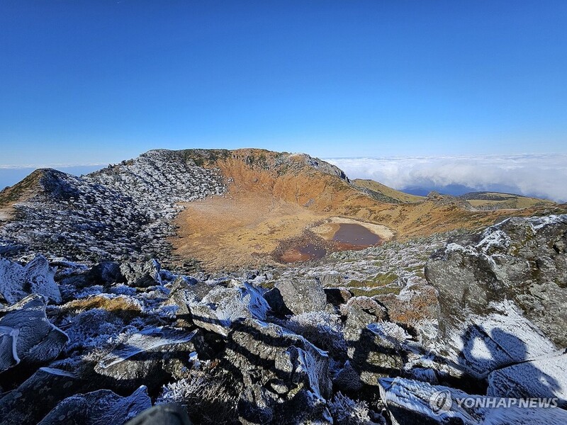 | ▲ 상고대 핀 아름다운 백록담 (제주=연합뉴스) 7일 새벽 한라산 백록담 일대 기온이 영하로 뚝 떨어지면서 상고대가 피어나 환상적인 모습이 연출됐다. 2023.11.7 [한라산국립공원관리소 제공. 재판매 및 DB 금지] |