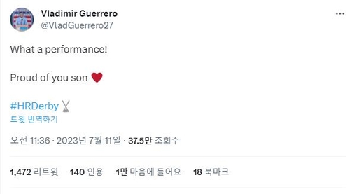 (서울=연합뉴스) 장현구 기자 = '괴수의 아들' 블라디미르 게레로 주니어(토론토 블루제이스)가 미국프로야구 메이저리그(MLB) 올스타전 홈런더비 최초로 아버지에 이어 부자(父子) 홈런왕 등극이라는 진기록을 세웠다.