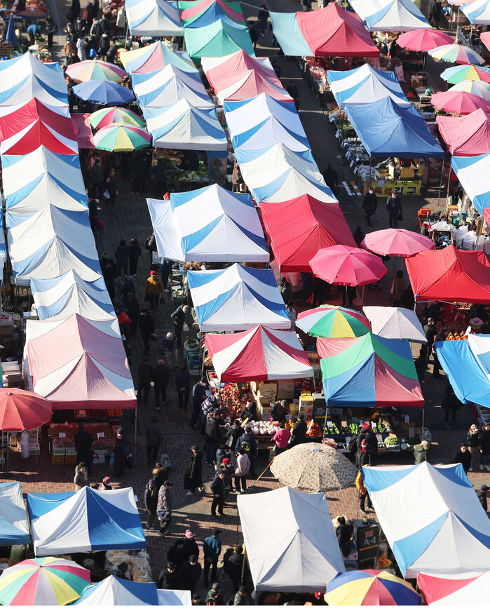 Shoppers visit the stalls of Moran Market, with each tent and umbrella being an individual merchant stand, in the city of Seongnam, south of Seoul, on Jan. 24, 2025, to buy food and offerings for traditional Korean rituals ahead of the Lunar New Year, known as Seol, which is one of the two major Korean traditional holidays and falls on Jan. 29 this year, forming part of a six-day break. Moran Market is the largest traditional five-day market in South Korea. (Yonhap)