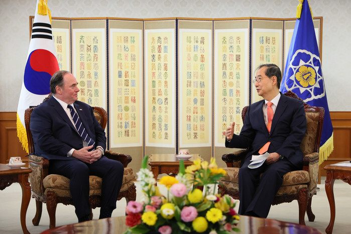 Acting President and Prime Minister Han Duck-soo (R) holds talks with Secretary of the U.S. Navy John Phelan during their meeting at the government complex in Seoul on April 30, 2025, in this photo released by Han's office. (PHOTO NOT FOR SALE) (Yonhap)
