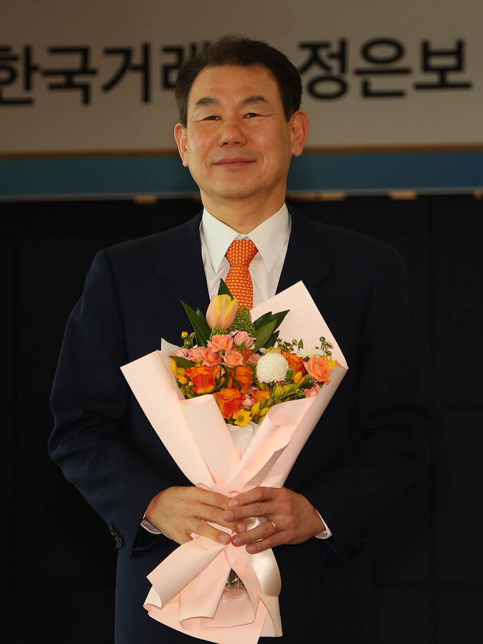 Jeong Eun-bo, new chief of the Korea Exchange, receives a bouquet during a ceremony at the exchange's headquarters in the southeastern port city of Busan on Feb. 15, 2024, to mark his inauguration. (Yonhap)