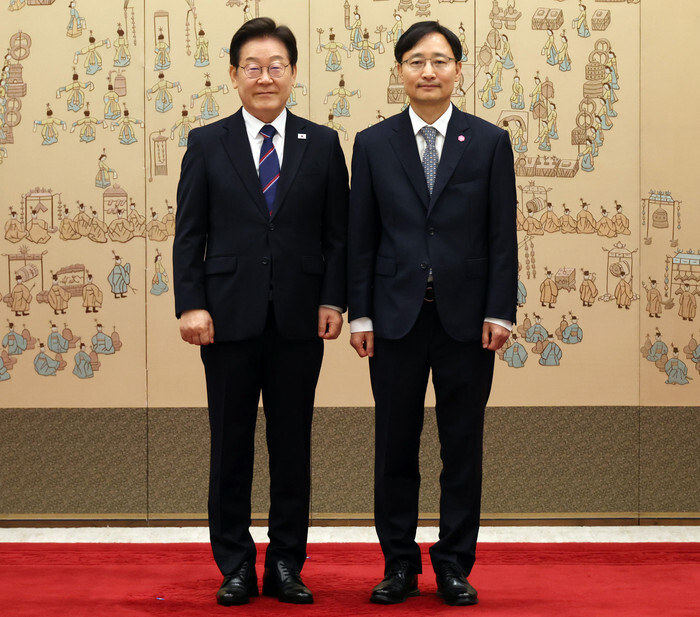 President Lee Jae Myung (L) poses for a photo with Lim Kwang-hyun, head of the National Tax Service, after presenting him with a letter of appointment at the presidential office in Seoul on July 28, 2025. (Yonhap)