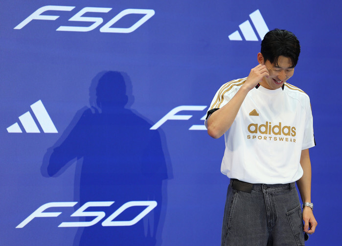 South Korean football star Son Heung-min poses for a photo during a fan meeting event in Seoul on July 6, 2024, to promote the launching of Adidas' F50. (Yonhap)
