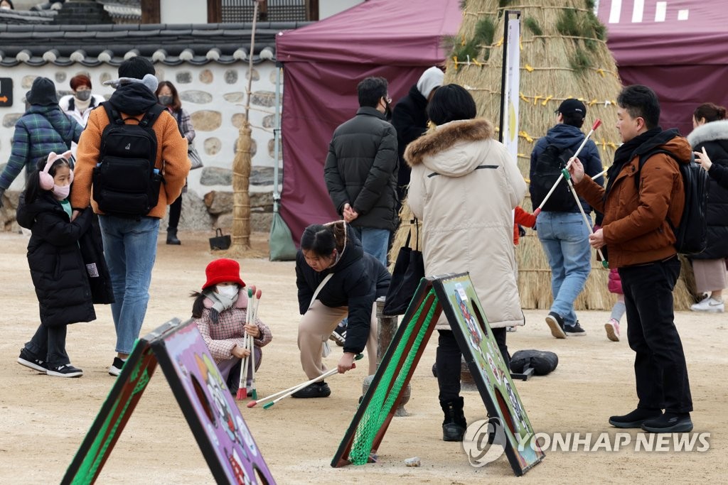 비슷한 시간 중구 필동 남산골 한옥마을은 투호 놀이, 말뚝이 떡 먹이기 등 여러 전통 놀이를 체험하는 사람들로 시끌벅적했다.