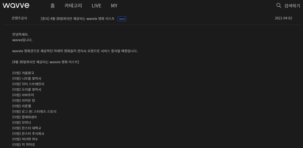 3일 웨이브에 따르면 월정액 영화 상품인 웨이비 영화관에서 제공하던 디즈니의 주요 콘텐츠들을 이달 말까지만 서비스하게 됐다.