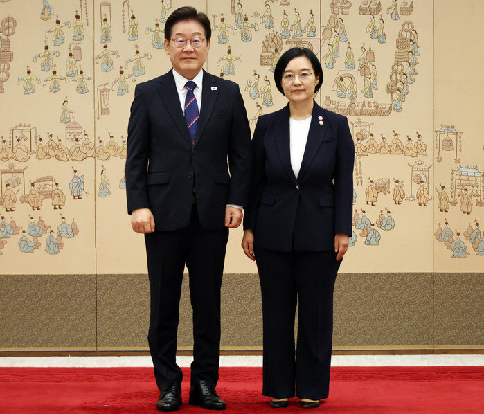 President Lee Jae Myung (L) poses for a photo with SMEs and Startups Minister Han Seong-sook after presenting her with a letter of appointment at the presidential office in Seoul on July 28, 2025. (Yonhap)