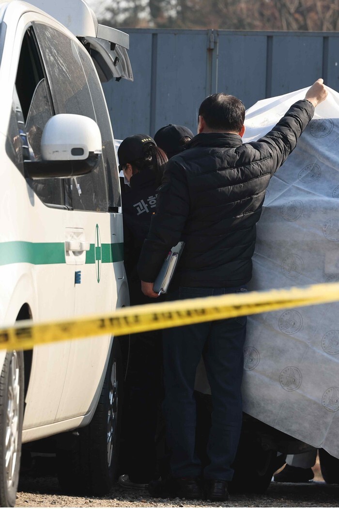 Police investigators examine a car at a park in Seoul's Jongno Ward on Dec. 27, 2023, after actor Lee Sun-kyun was found dead inside the car in an apparent suicide earlier in the day, with a charcoal briquette laid in the passenger seat. Lee, who played a main role in the Oscar-winning "Parasite," has been under a prosecution probe over suspected drug use. (Yonhap)