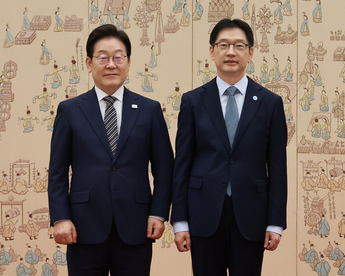 President Lee Jae Myung (L) poses for a photo with Kim Kyoung-soo, newly appointed chief of the Presidential Committee for Balanced National Development, after presenting him with a letter of appointment at the presidential office in Seoul on July 23, 2025. (Yonhap)