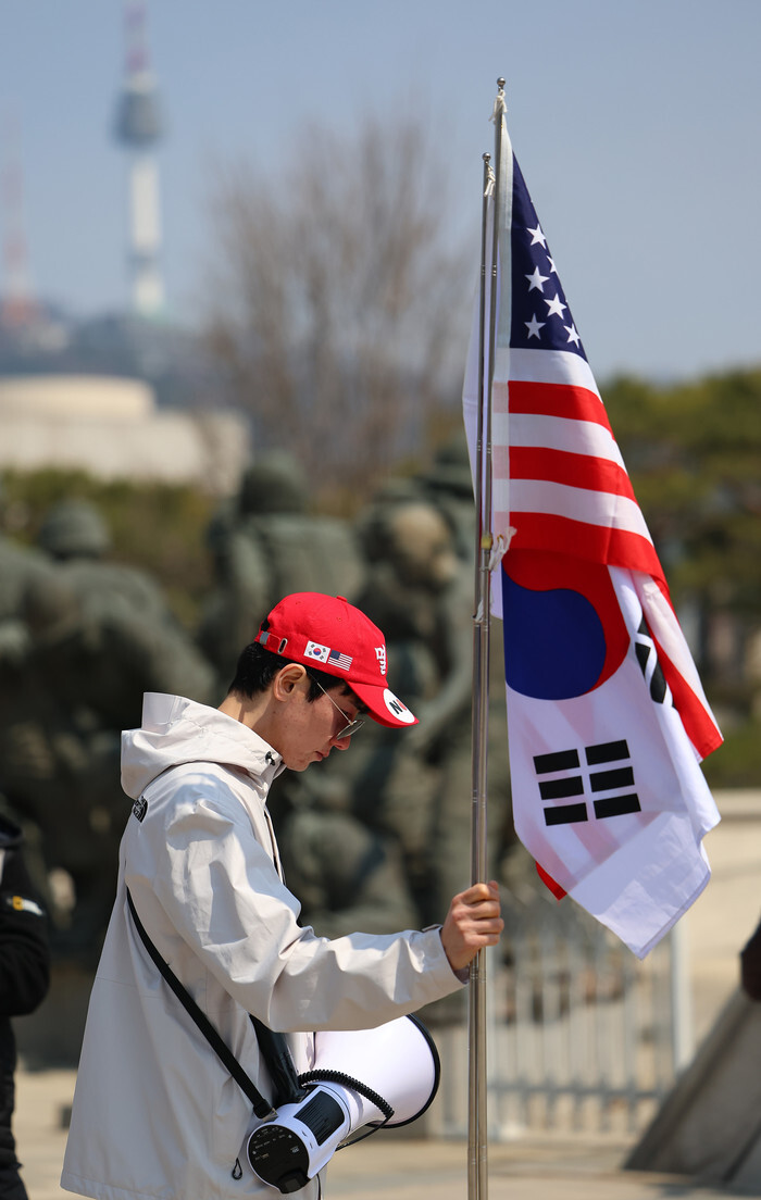 A supporter of impeached President Yoon Suk Yeol looks dejected at a rally near the presidential office in Seoul on April 4, 2025, after the Constitutional Court upheld the impeachment of Yoon, removing him from office over his short-lived imposition of martial law in December. (Yonhap)