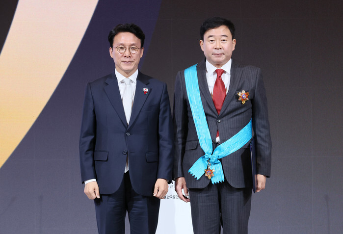 Prime Minister Kim Min-seok (L) poses for a photo with Lee Dong-hyun, head of Korean in-vitro diagnostics company Osang Healthcare Co., after conferring the Gold Tower Order of Industrial Service Merit on Lee during a ceremony at a Seoul hotel on Dec. 1, 2025, to mark the 11th anniversary of Middle Market Enterprises' Entrepreneurs Day. (Yonhap)